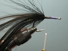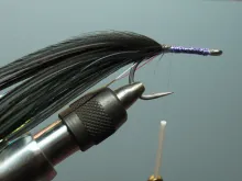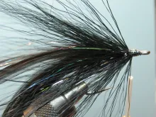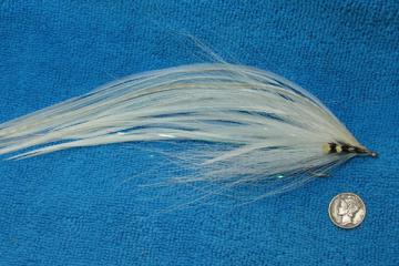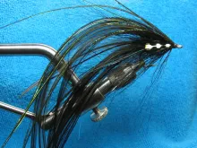 Another variation on large saltwater flies from the hands of Pete Gray. Mainly for striped bass, but useful for other specied too. This is the sinister version for fishing in darkness - or for dead drifting at O'dark thirty as Pete puts it.