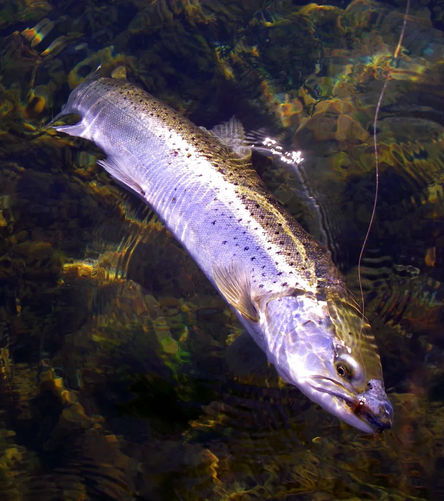 Don't let the silver appearance cheat you. This large and slender fish is obviously a kelt that should have its freedom back as soon as possible