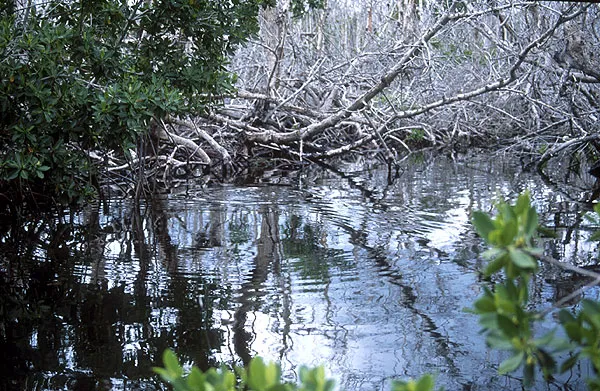 Talk about challenging. Below this ring a tarpon up to 10 lbs. may be hunting. Hook it, and you are in for a job keeping it out of the trees! And that's the part of the trees in the air! Not in the water...