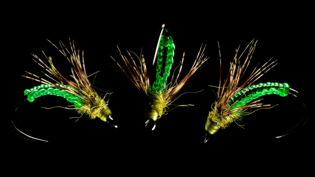 Body structure; rows of translucent ridges along the sides of the hook with the dark metal of the hook showing through along the top and bottom.