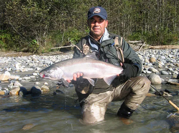 Fellow angler Don MacLean with a beautiful coho. This image has been cropped close to yield a picture in landscape format. The original was taken in portrait format.