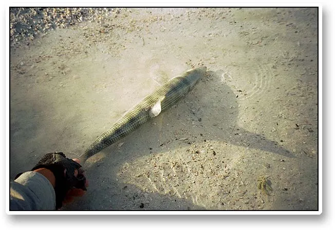 This fish is about ready to swim off. Notice the long shadow. Bonefishing is very good early morning. The fish are actively tailing and quite easy to see.
