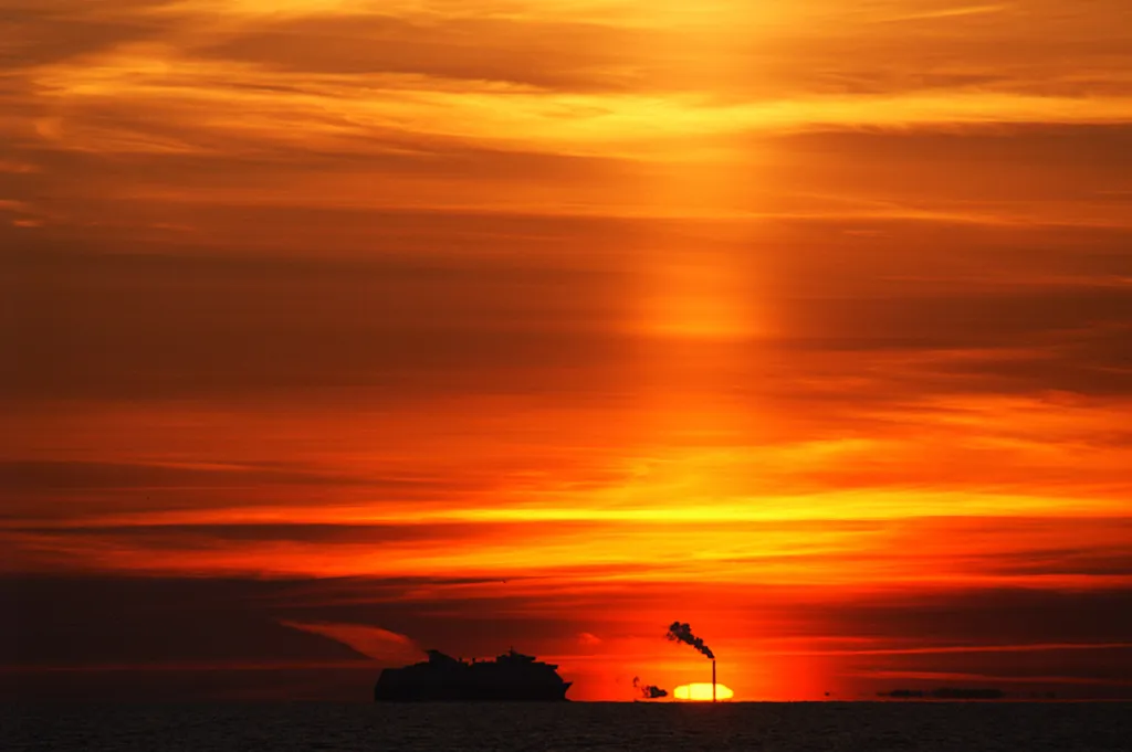 This sunset was really extreme, but it has been enhanced even further by using a telephoto lens and zooming in on the ship, sun and smokestack.