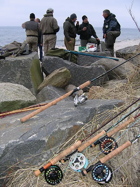 While the anglers gather on the beach for coffee and a chat, the gear has its own summit in the background, discussing the angler's casting faults and complaining about the aching ferrules. Notice how the spinning rod is not a part of the "fly gang" - the poor bastard.