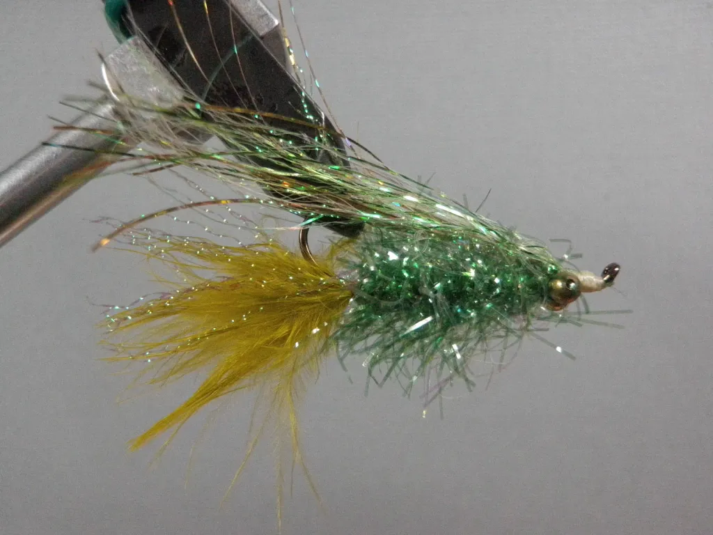 Green and olive Freaner Flasher with brass bead chain eyes tied on a Mustad 9672 hook.
