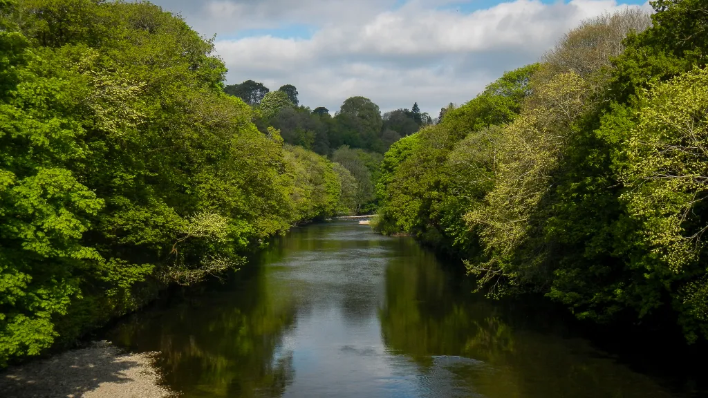 My local urban river in spring, the trout hang out in the shade under the trees on the left.