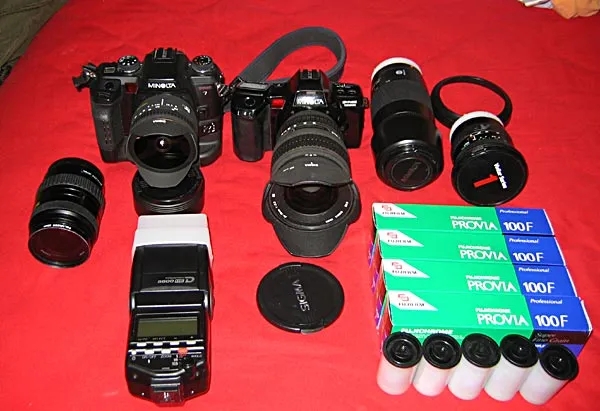 This picture was taken while I was packing for a trip to Belize. From my film era, but still representative of what I use: SLR, plenty lenses and an external flash.