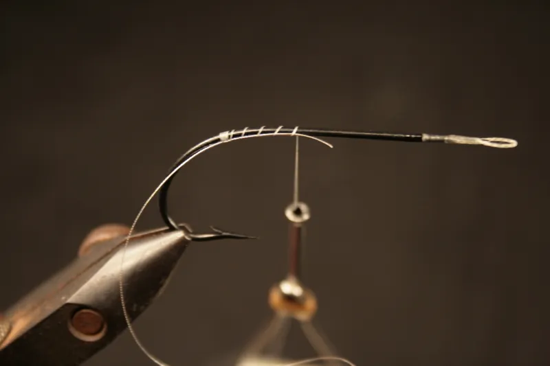 I use the rule of 7 ties here, which means, I use 2 wraps to tie in the material and then 5 more wraps to tightly secure the material while I am working with it. After the tinsel has been wrapped its possible to unwind those 5 extra thread wraps and tie the tinsel down with 2 tight wraps. This saves a lot of potentially unwanted wraps that might leave a not smooth under body to work on. Don't cut off any of the ends just yet.