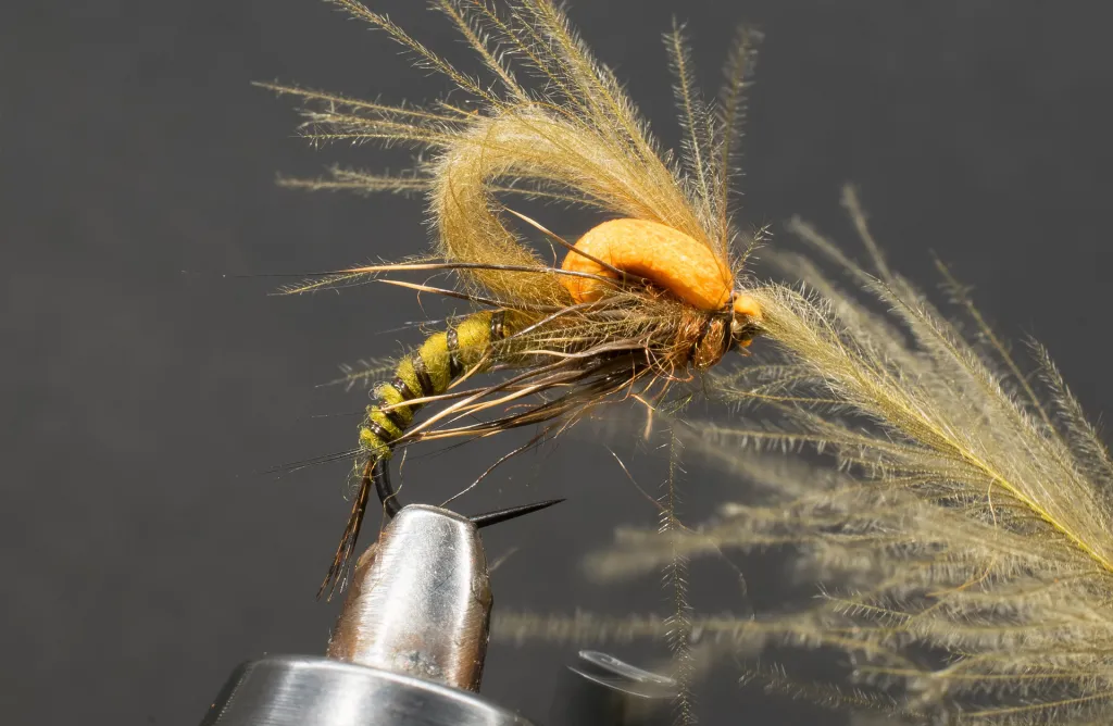 Bend the CDC feather forward in an open loop, arcing the foam and creating a ragged wing. Trim the front of the feather, but eave the loose barbs. Whip finish and cut thread. Varnish in the groove in the foam.