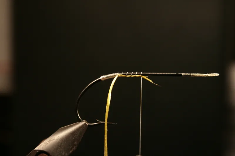 Again use 2 wraps and 5 more to secure it during the handling of the floss. Wrap the floss backwards down towards the tinsel and back forward again, when you reach the tie off point unwind the 5 extra wraps and tie off the floss with 3 tight wraps.