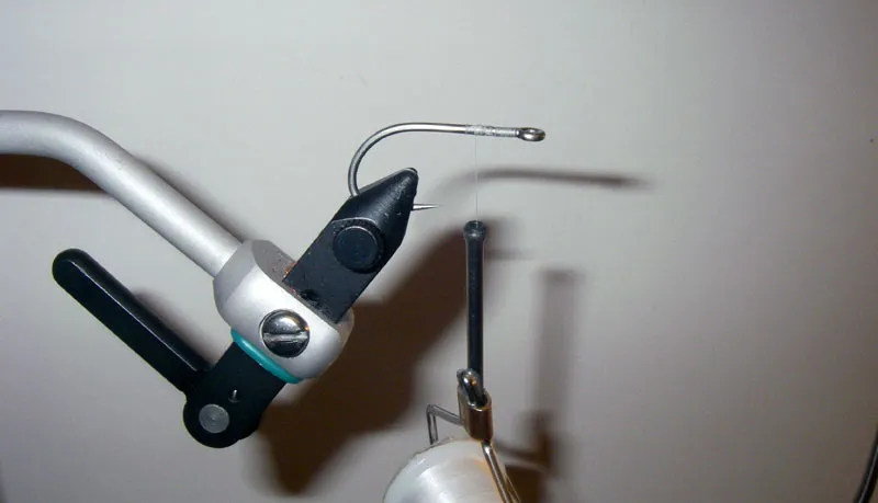 Lay down a base of thread on front the hook. Take care not to wrap to far back. You need enough room to add some buck tail and palmer a large hacklefeather