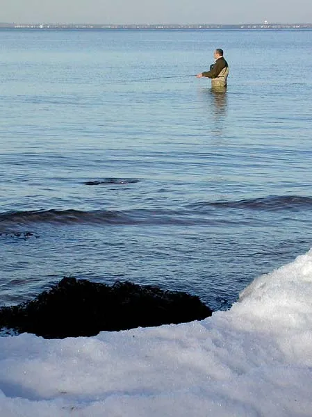 Yours truly in waist deep water, which is just barely above the freezing point. But since it is calm, I have let go of the cap and the jacket, and just wear a thick fleece jacket with an inner wind breaking layer.