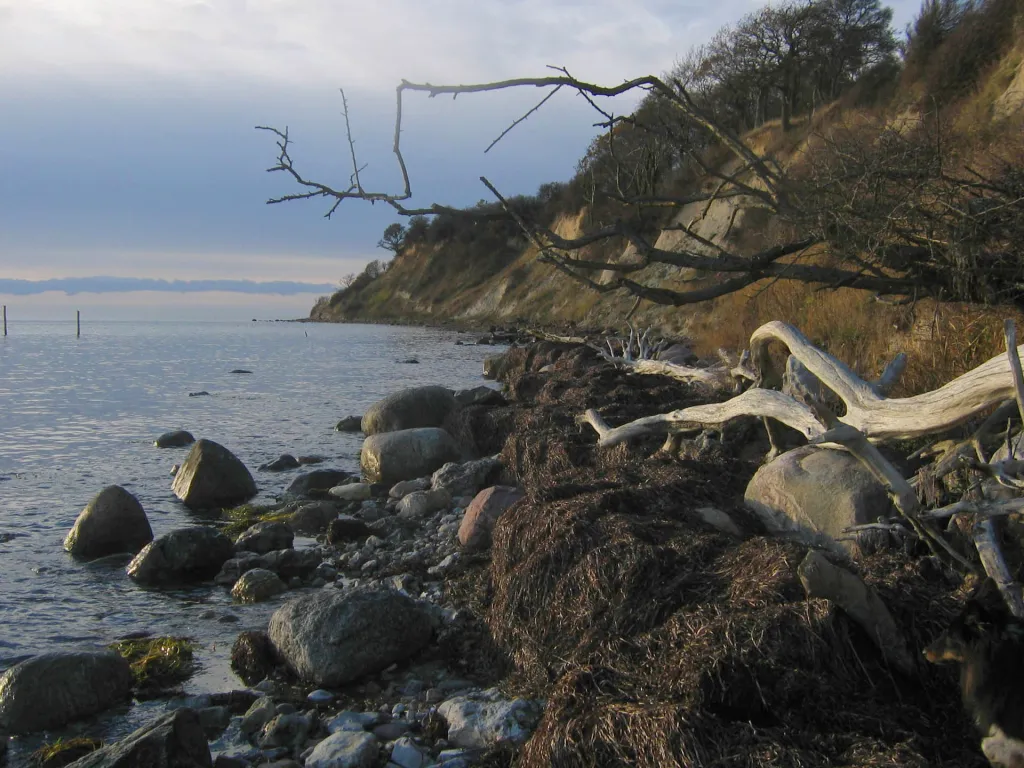 Autumn storms often bring sea weed from the ocean and blows down trees from the cliffs, making the beach quite a challenge to walk on.