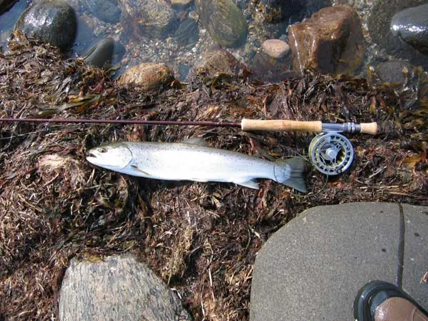 A typical skinny post spawn fish resting on the sea weed for a quick photo before its release. Fish like this one and larger seem to be enticed by the small and obscure Triangle Fly.