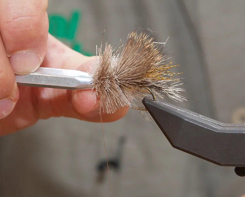 When the last bunch is tied in and spun, press it back with a hollow tube. Turn the thread around the tube before doing so, and slip these turns off the tube onto the hook shank to lock the thread.