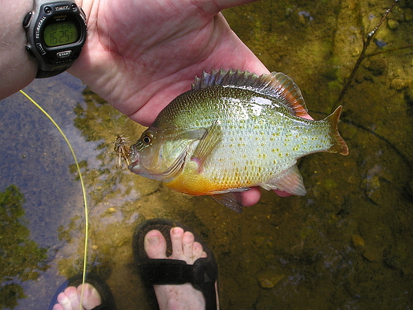 A cute red-breasted sunfish at my "after-work" creek. This one hit a stimulator fished with some drag like a popper.