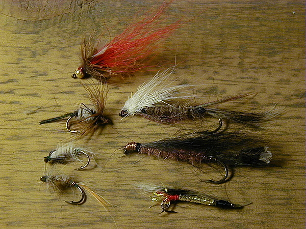 from bottom left, 3 assorted nymphs, shrimp, albino faced sclupin, stonefly, flinn variation.